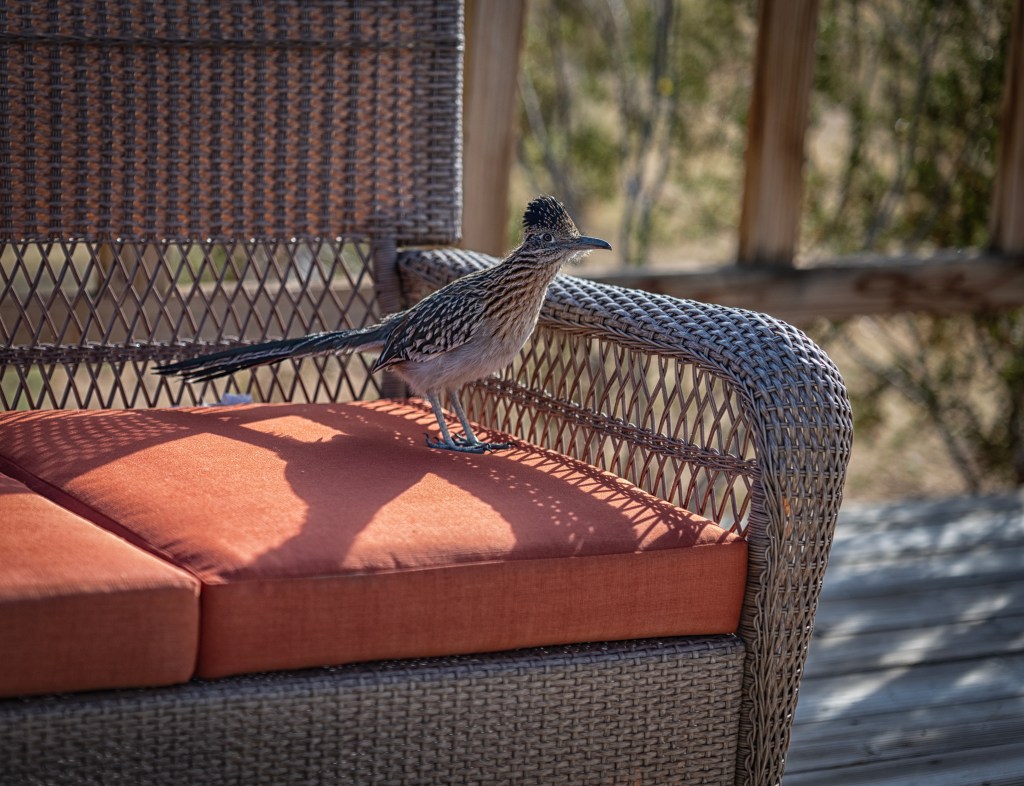 The male and female roadrunners came to the door, chirping and squawking for food. I know I shouldn’t feed them, but they arrived last week so determined and demanding. I wondered if they had been fed before. How could they have known to come to me? Now they follow me around the property.
